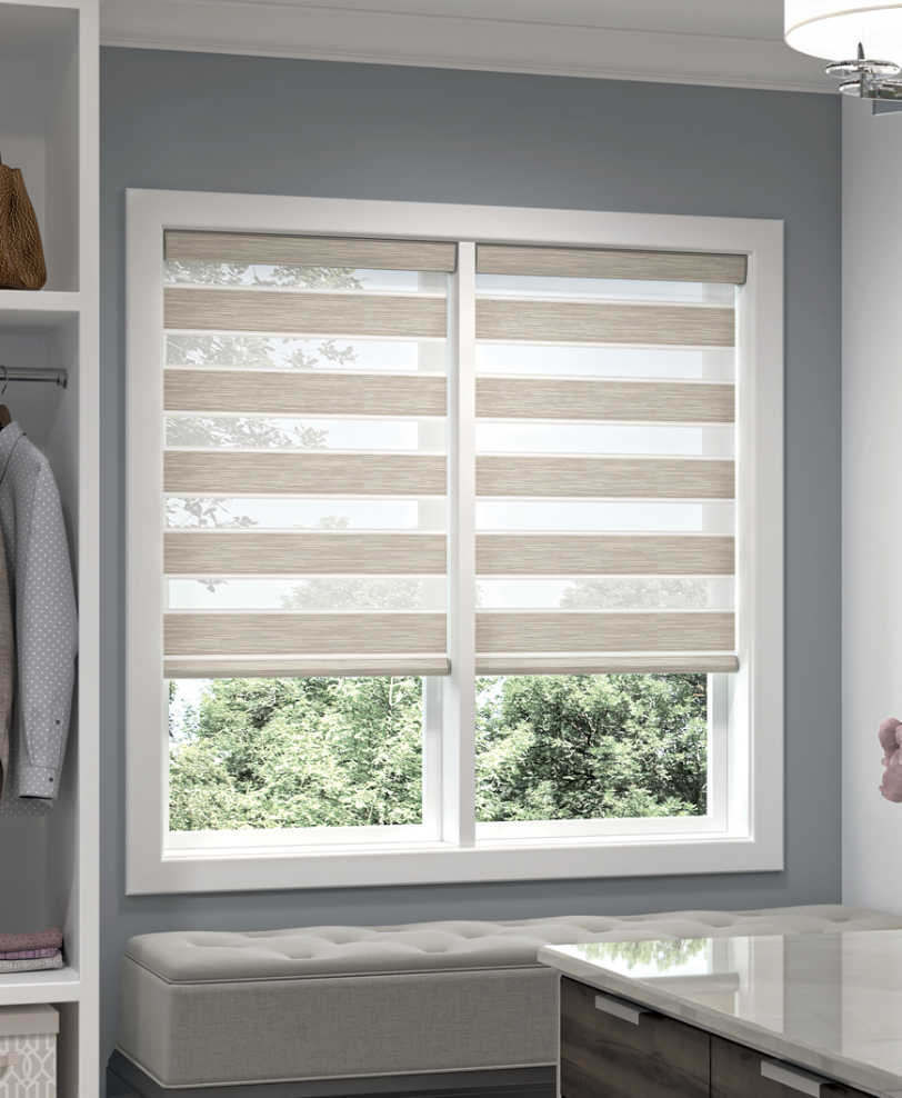 Transitional Shades are unique in both style and function. An imaginative blend of modern shades and horizontal blinds, Allure Transitional Shades offer complete control of light and privacy. Alternating vanes of sheer and light filtering or room dimming fabric lets you enjoy the view while still diffusing the light and maintaining your sense of privacy. You’ll be amazed by the nearly endless variety of light control and viewing options while still being able to raise and lower your shade at any level.